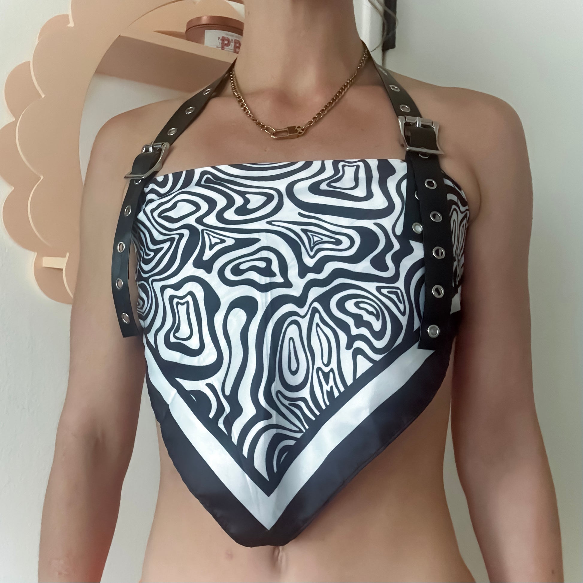 Make a statement with this striking handmade halter top, featuring a silky scarf printed in bold black and white abstract swirls with a sleek satin border. The structured look is balanced with soft draping and a flattering pointed hem. Faux leather buckle straps with silver grommets add an edgy touch, while the open lace-up back allows for a fully adjustable, one-size-fits-most fit. Whether styled with cargos or layered under a jacket, this top delivers attitude with polish.