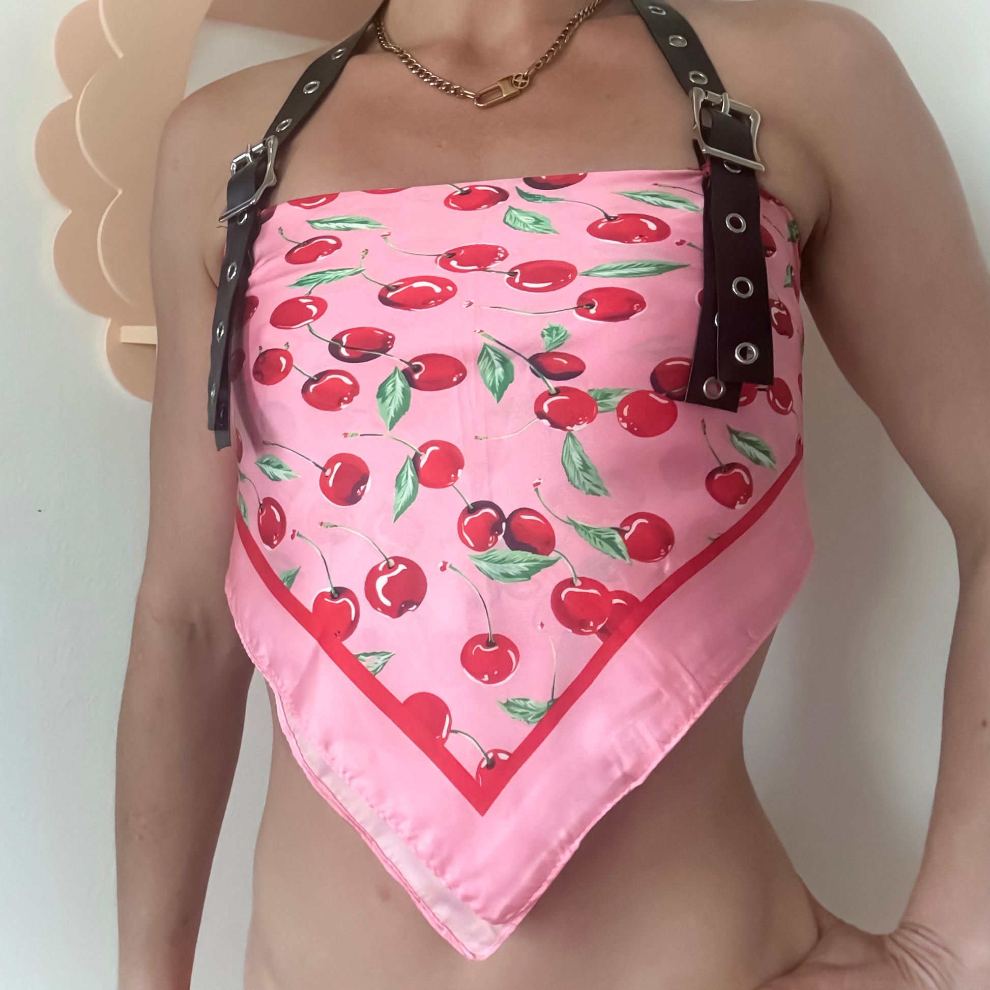 A handmade cherry-print crop top. Made from a silky pink scarf featuring vibrant red cherries and trimmed with a matching red border, it’s cut in a flattering handkerchief silhouette. The top is secured with black faux leather straps detailed with silver grommets and metal buckles for an edgy contrast. Straps are fully adjustable to fit most sizes comfortably.