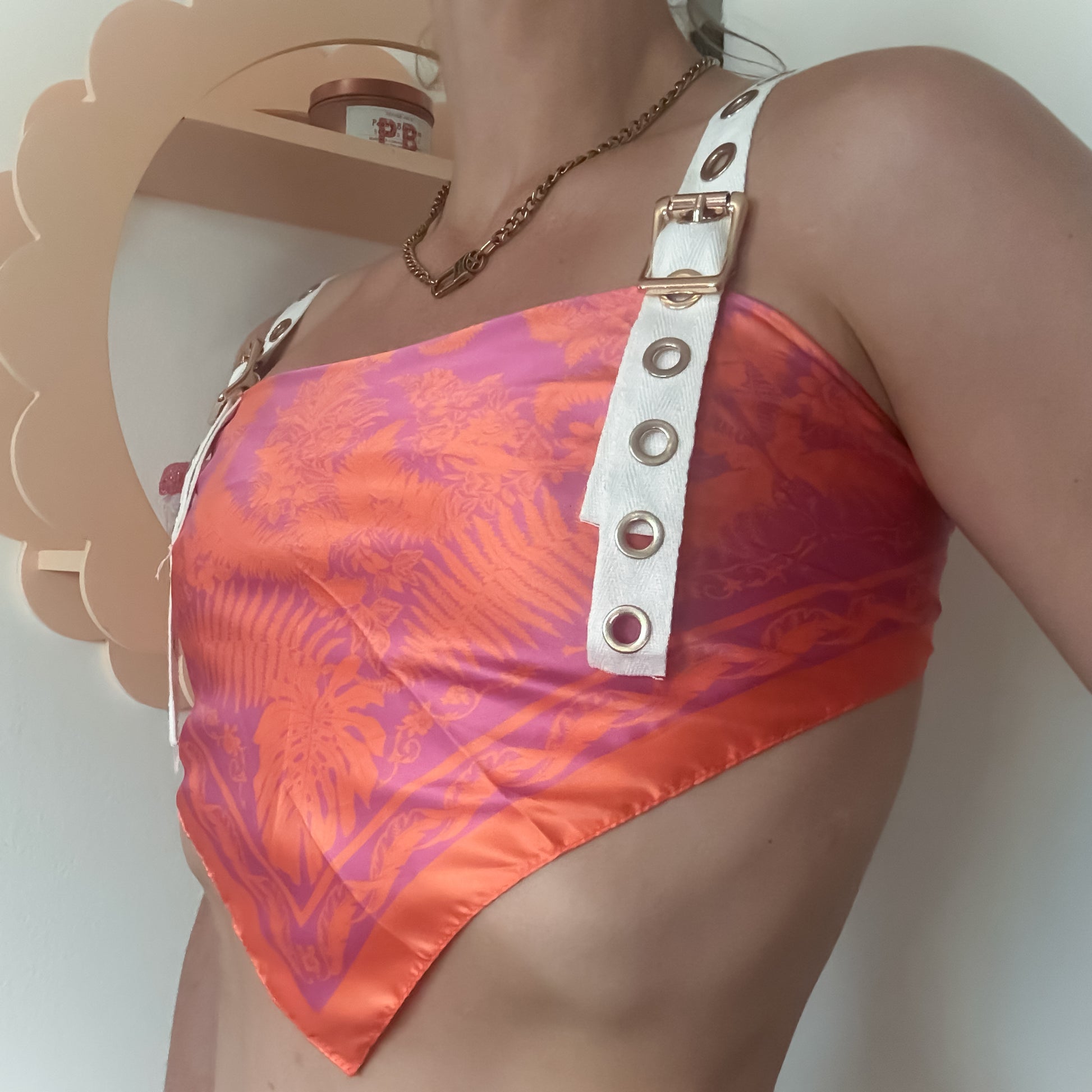 This vibrant handmade crop top features a silky scarf in bold pink and orange hues, with a tropical foliage print and a pointed handkerchief hem that flatters the waist. The white straps are detailed with oversized silver grommets and functional gold-tone buckles, offering a playful contrast and an edgy finish. The straps are fully adjustable for a comfortable, one-size-fits-most fit. Perfect for warm weather, music festivals, or making a statement wherever you go.
